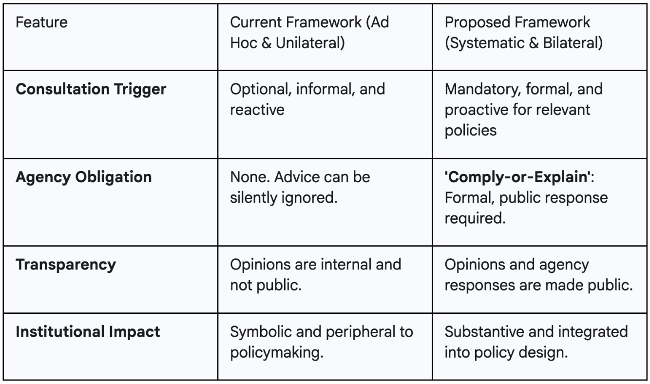 The solution to transforming TCCT’s advocacy from a symbolic gesture into a substantive force for economic good lies in redesigning the process itself. The system must evolve from a unilateral, optional suggestion into a bilateral, necessary dialogue. This requires the creation of a formal, systematic consultation mechanism that ensures competition analysis is not just offered, but is actively considered at the heart of policymaking. Based on international best practice and the specific context of Thailand’s governance structure, we propose a pragmatic, three-tiered approach to achieve this reform.