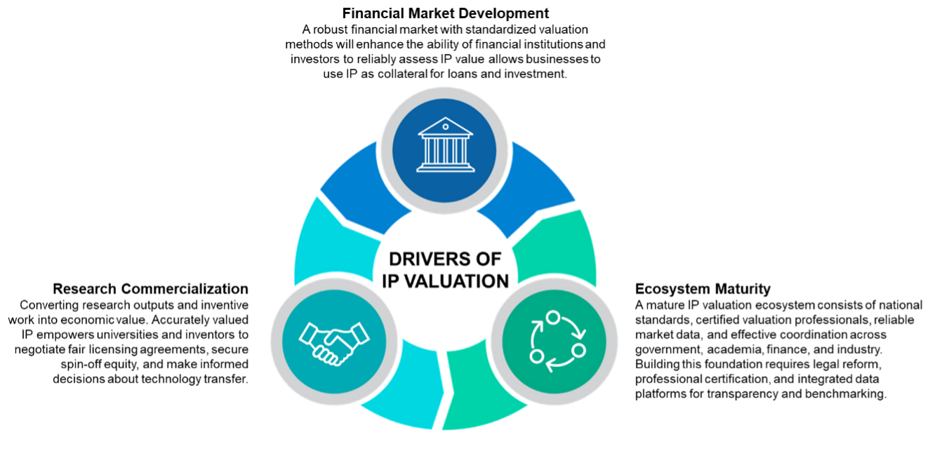 First, developing national IP valuation guidelines establishes Thailand's own standards aligned with global benchmarks such as those established by the International Valuation Standards Council (IVSC) and the International Organisation for Standardisation (ISO). These guidelines create official, trusted methods for valuing intellectual property, strengthening both the reliability and confidence of valuations across the entire ecosystem.